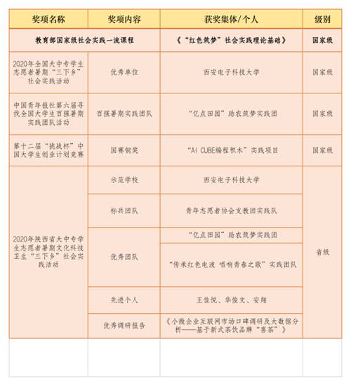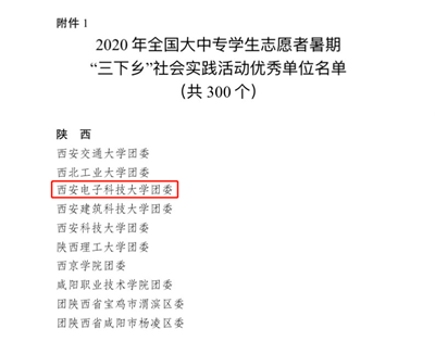 (通讯员 王佳悦王鑫)近日,教育部公布了国家级一流课程名单,学校《“红色筑梦”社会实践理论基础》课程获批国家级社会实践一流课程。同时西电团委荣获共青团中央2020年全国大中专学生志愿者暑期“三下乡”社会实践活动优秀单位等荣誉。