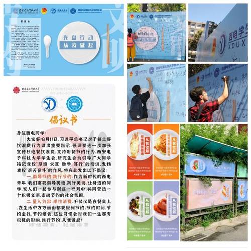 西电学生会也积极响应学校号召,组建实践团队,开展线上线下形式多样的活动,提倡“光盘行动”,号召勤俭节约,团队有学生骨干60余名,影响人次达两万以上。充分借助线上平台优势,撰写倡议书,依托公众号,号召大家身体力行、诠释节约,推文总阅读量达1万以上;制作宣传标语,于公众号空间、微博平台宣传,累计浏览量达5000以上;在素质能力拓展系统中开发“光盘打卡”模块,呼吁广大同学积极参与、坚持打卡。在理论学习上持续开展系列活动,截至目前,共开展相关学习16场,参与学习的学生骨干人数达800人以上。发挥学生骨干的模范带头作用,为学校食堂提供宣传介绍、引导督促、协助工作等志愿服务,积极推介“小份套餐”,引导师生按需点餐。
